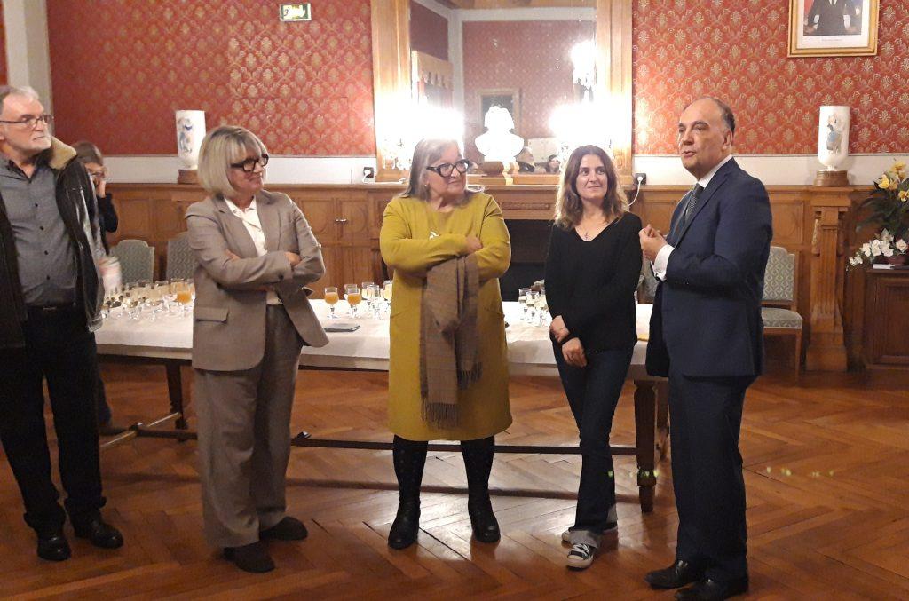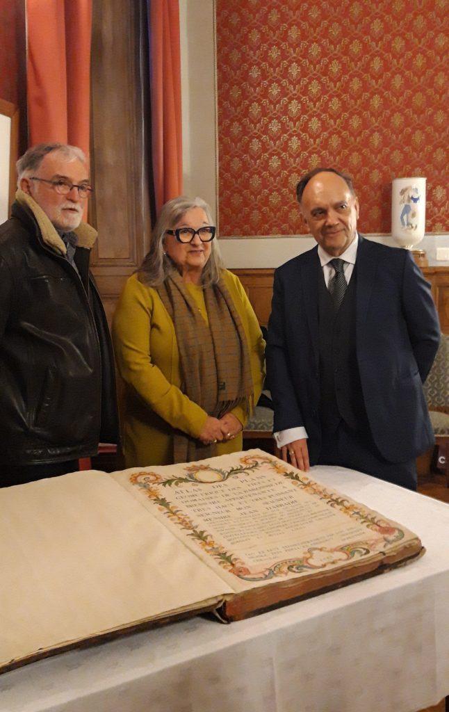 Samedi 12 décembre, Mme le Maire, accompagnée de Mme la conseillère municipale en charge des Archives municipales et Mme la directrice des Archives municipales, a réuni dans les salons de l’Hôtel de Ville les généreux donateurs qui ont permis aux Archives municipales d’acquérir le magnifique Atlas de la baronnie de Bressuire, réalisé en 1788 sur ordre de Jean d’Abbadie seigneur de Bressuire. M. Lenne, président d’HPB à l’origine de cette opération de mécénat, a remis un chèque de 2730 euros à Mme le Maire. Cette cérémonie a eu lieu en présence de M. Guillaume d’Abbadie, descendant du dernier seigneur de Bressuire.